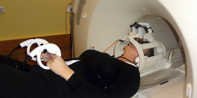A person lies in an fMRI scanner or wears a high-density EEG cap.